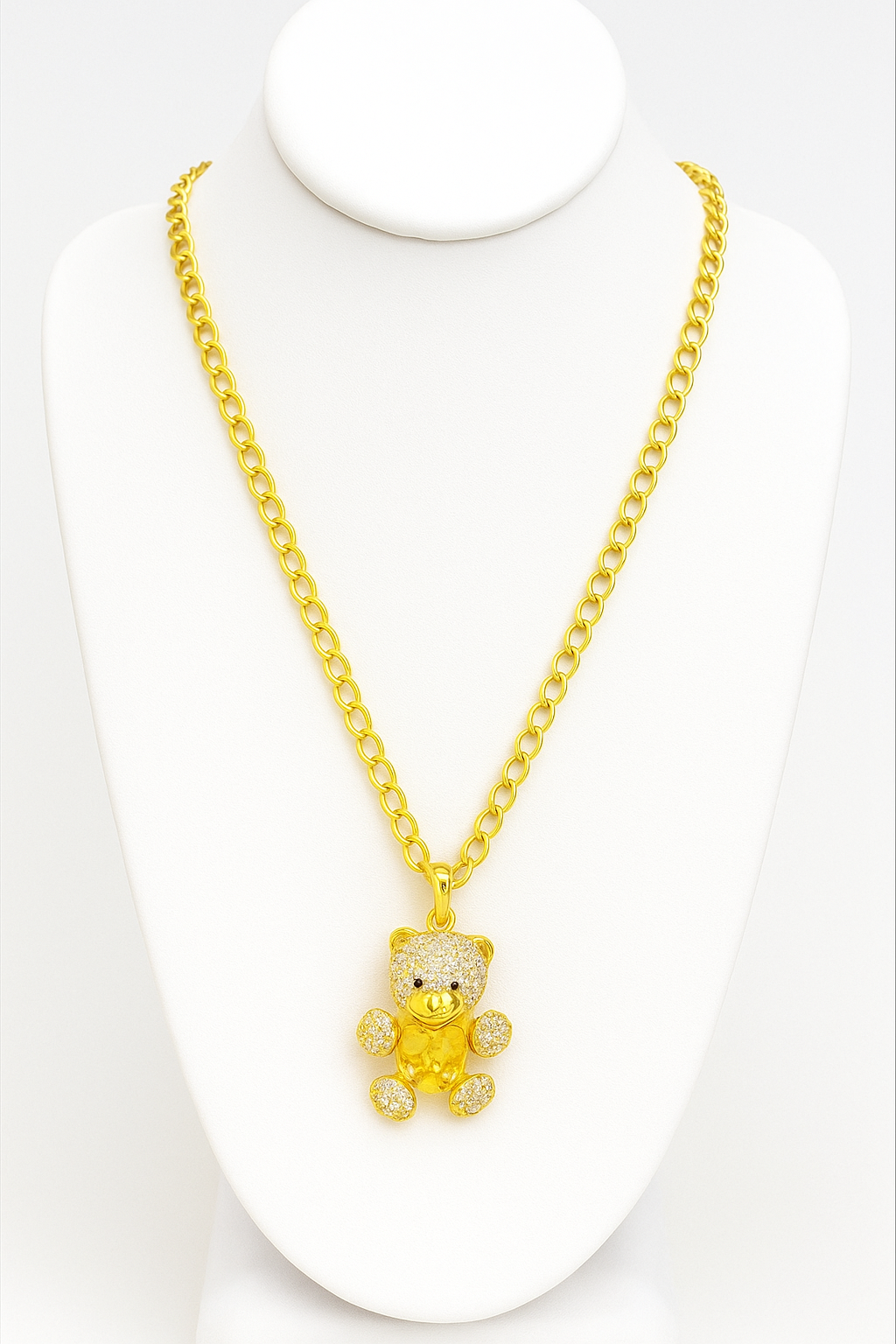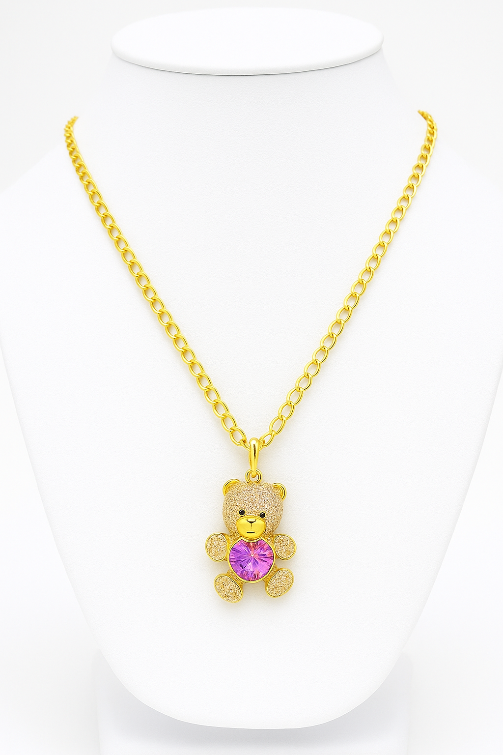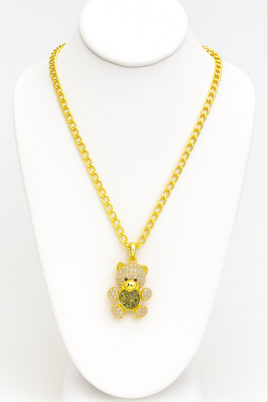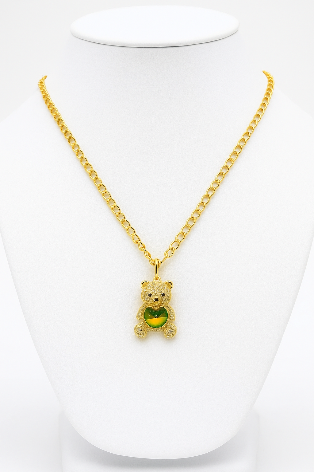 -Osito con corazón amarillo dorado: Encantador dije de osito con incrustaciones de circonias y un corazón central en cristal amarillo brillante, que transmite alegría y energía positiva.