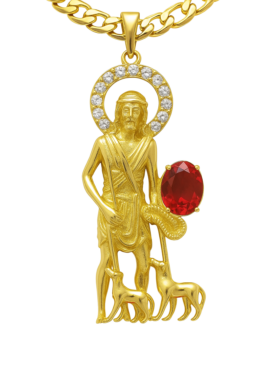 Elegante cadena de 50 cm de largo con baño en oro laminado de 14k, diseñada con eslabones tipo cubanos que aportan brillo y resistencia. El centro de la pieza destaca por un dije de San Lázaro, símbolo de fe y protección, elaborado con gran detalle en acabado dorado. El santo aparece acompañado de sus perros, con un aro incrustado de circonias brillantes y un adorno en piedra roja que resalta la devoción y el estilo de esta joya. Ideal para quienes buscan un accesorio con significado espiritual y presencia distinguida.