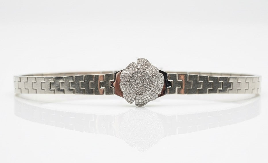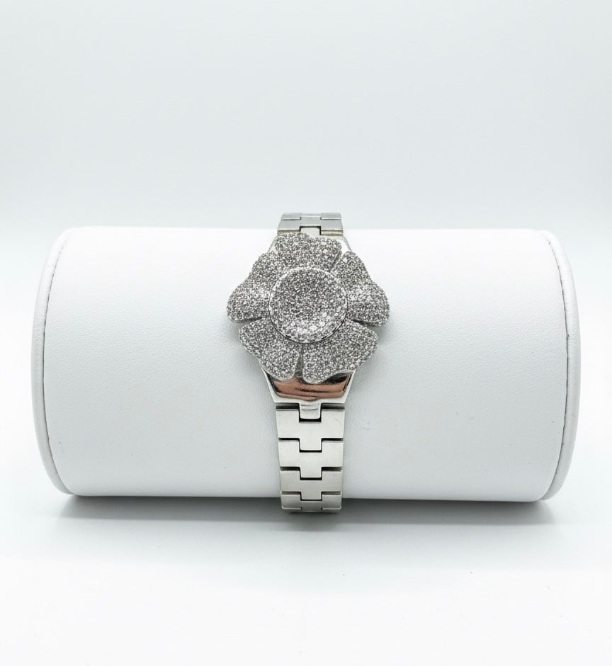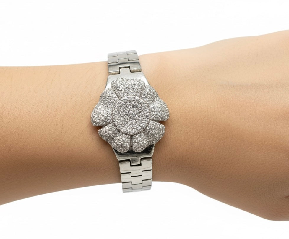 Esta elegante manilla tipo reloj de 18.5 cm de largo combina sofisticación y brillo en un diseño moderno y femenino. Destaca por su centro en forma de flor adornado con zirconias relucientes que aportan un toque de lujo, mientras que su estructura de eslabones rectangulares con baño de plata garantiza durabilidad y un acabado impecable. Es el accesorio perfecto para complementar cualquier estilo con elegancia y distinción.