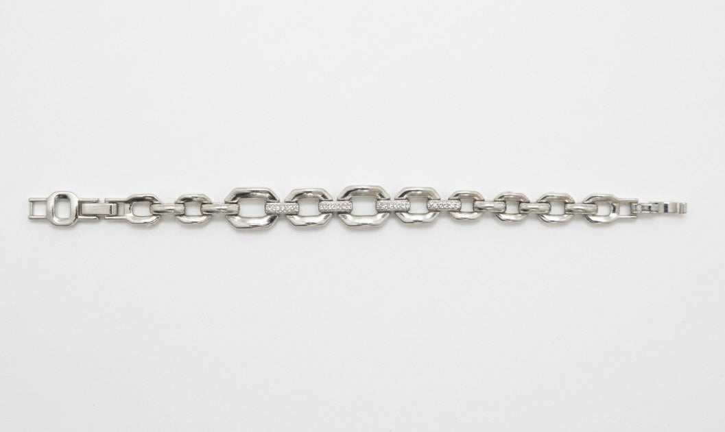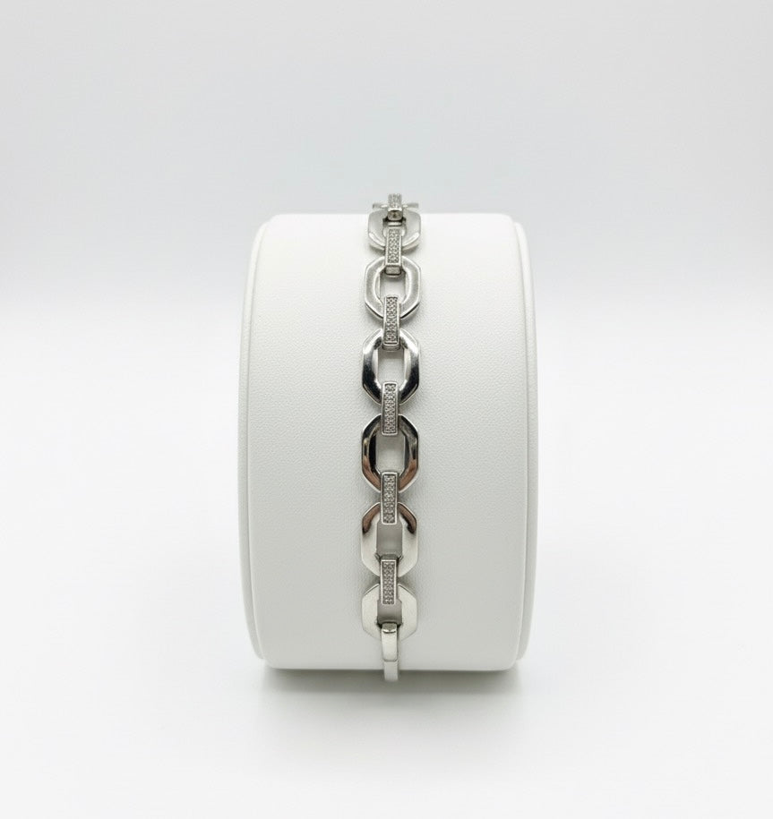 Esta elegante manilla de mujer destaca por su diseño moderno de eslabones anchos y brillantes, elaborada con un fino baño de plata que le aporta un acabado sofisticado y duradero. Con una longitud de 17.5 cm y extensión de reducción ajustable, se adapta cómodamente a la muñeca para ofrecer un ajuste perfecto. Su estilo versátil la convierte en el complemento ideal tanto para looks casuales como elegantes, añadiendo un toque de distinción a cualquier ocasión.