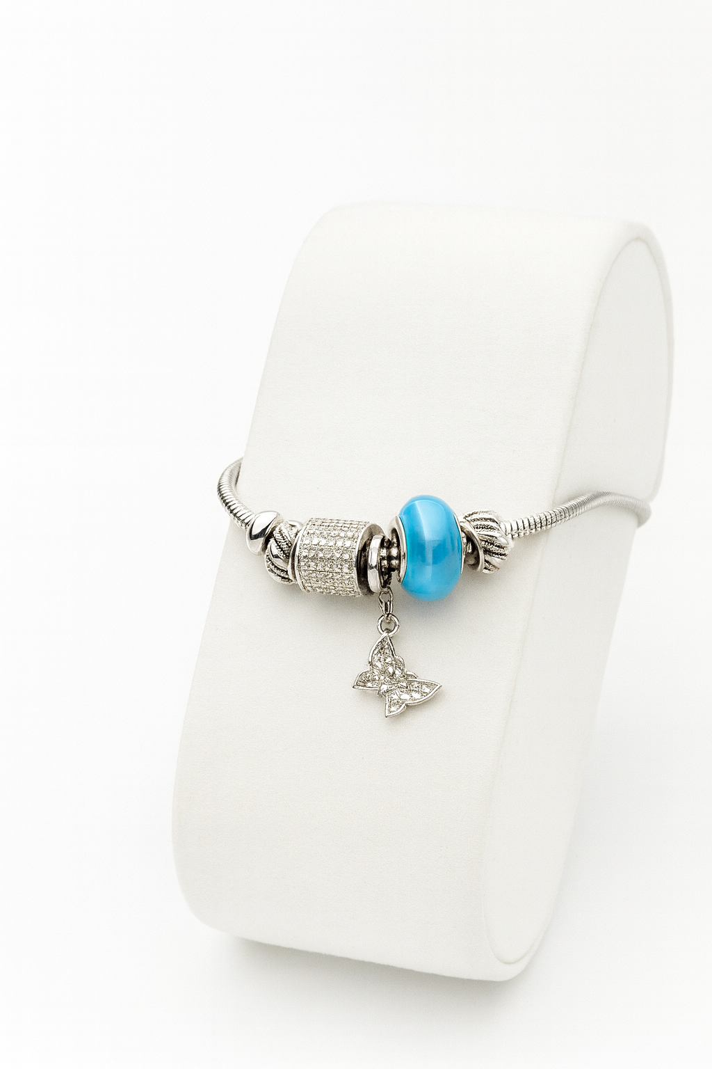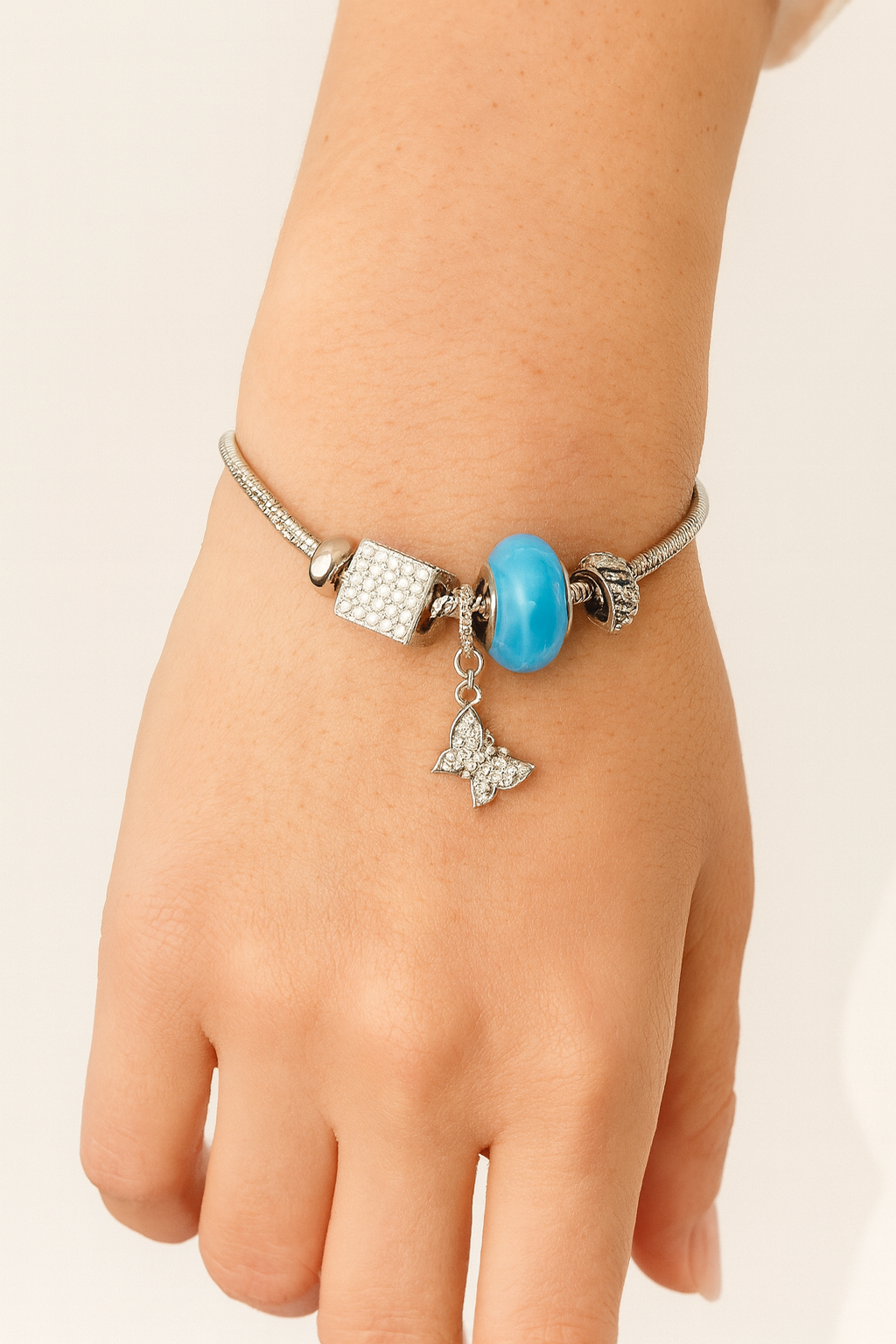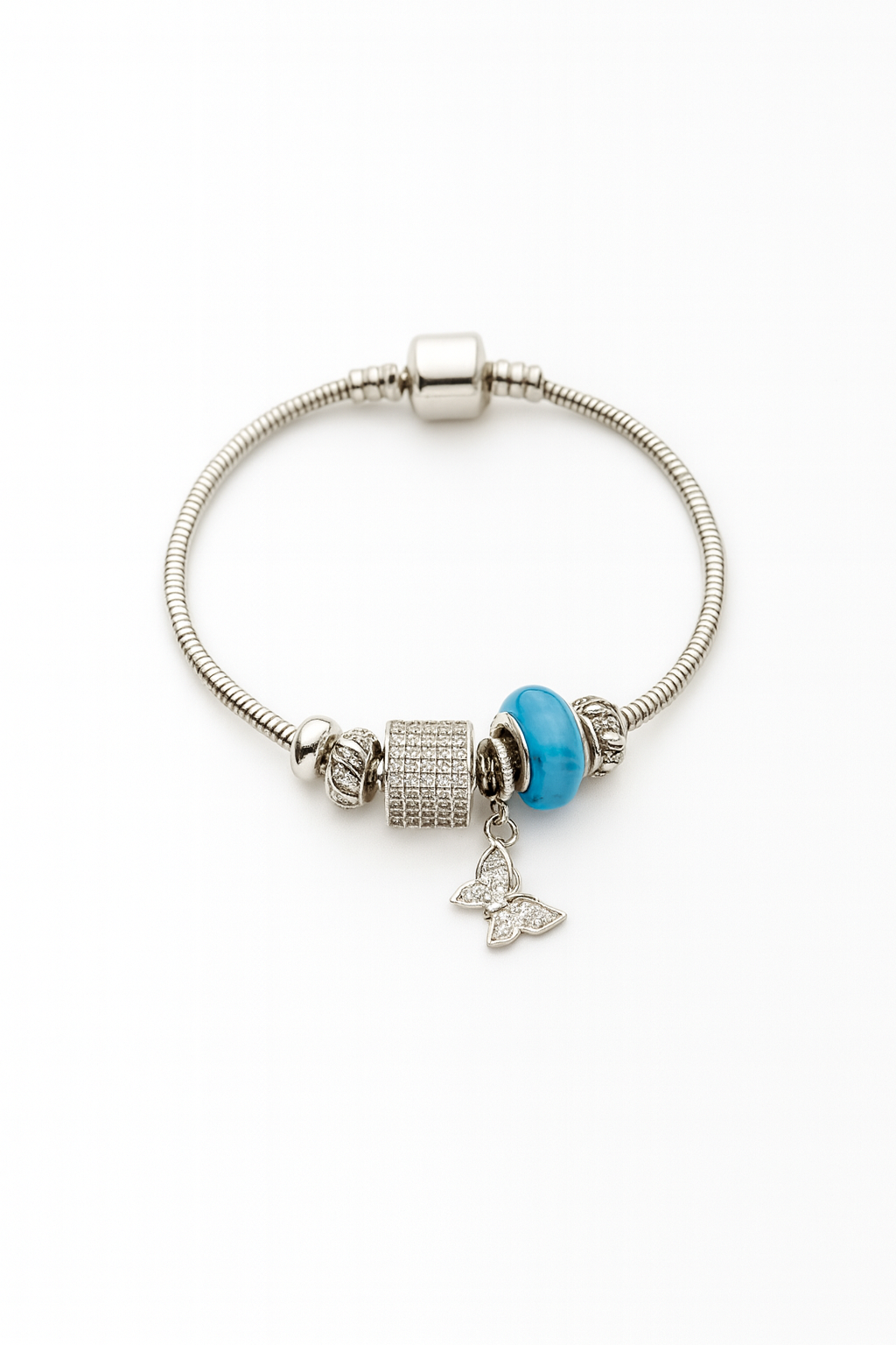 Elegante manilla de 18 cm de largo con baño de plata, perfecta para añadir un toque delicado y sofisticado a cualquier look. Su estructura tipo serpiente se ajusta cómodamente a la muñeca, mientras que sus charms decorativos, incluyendo un colgante en forma de mariposa brillante y un detalle central en tono celeste intenso, aportan un estilo moderno y femenino. Ideal para uso diario o para ocasiones especiales, esta joya destaca por su brillo sutil y diseño encantador.