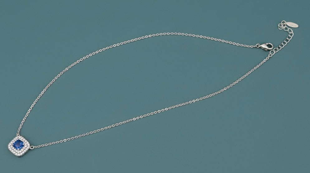 Este sofisticado set de mujer incluye una delicada cadena de 47 cm de largo y un par de elegantes aretes, todos con un fino baño de plata que resalta su brillo y durabilidad. El diseño destaca por sus piedras azules centrales rodeadas de destellos cristalinos, aportando un toque de glamour y distinción. Perfecto para ocasiones especiales o para complementar tus looks con un estilo refinado y femenino.